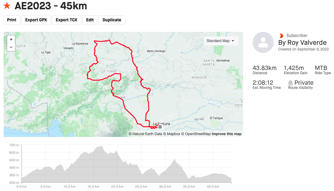 * Los datos pueden tener pequeñas variaciones dependiendo de la computadora que se use en la bicicleta, de la aplicación en el celular o computadora y de la velocidad que se haga la ruta. Además, en la zona del Arenal hay algunas secciones donde la señal es limitada.